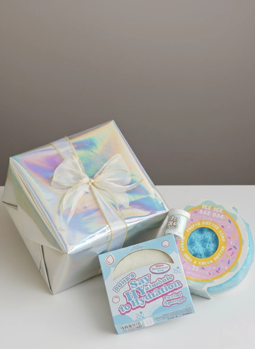 Viskas supakuota į spindinčią holografinę dėžutę su kaspinu – paruošta dovanoti be jokių rūpesčių! 💝